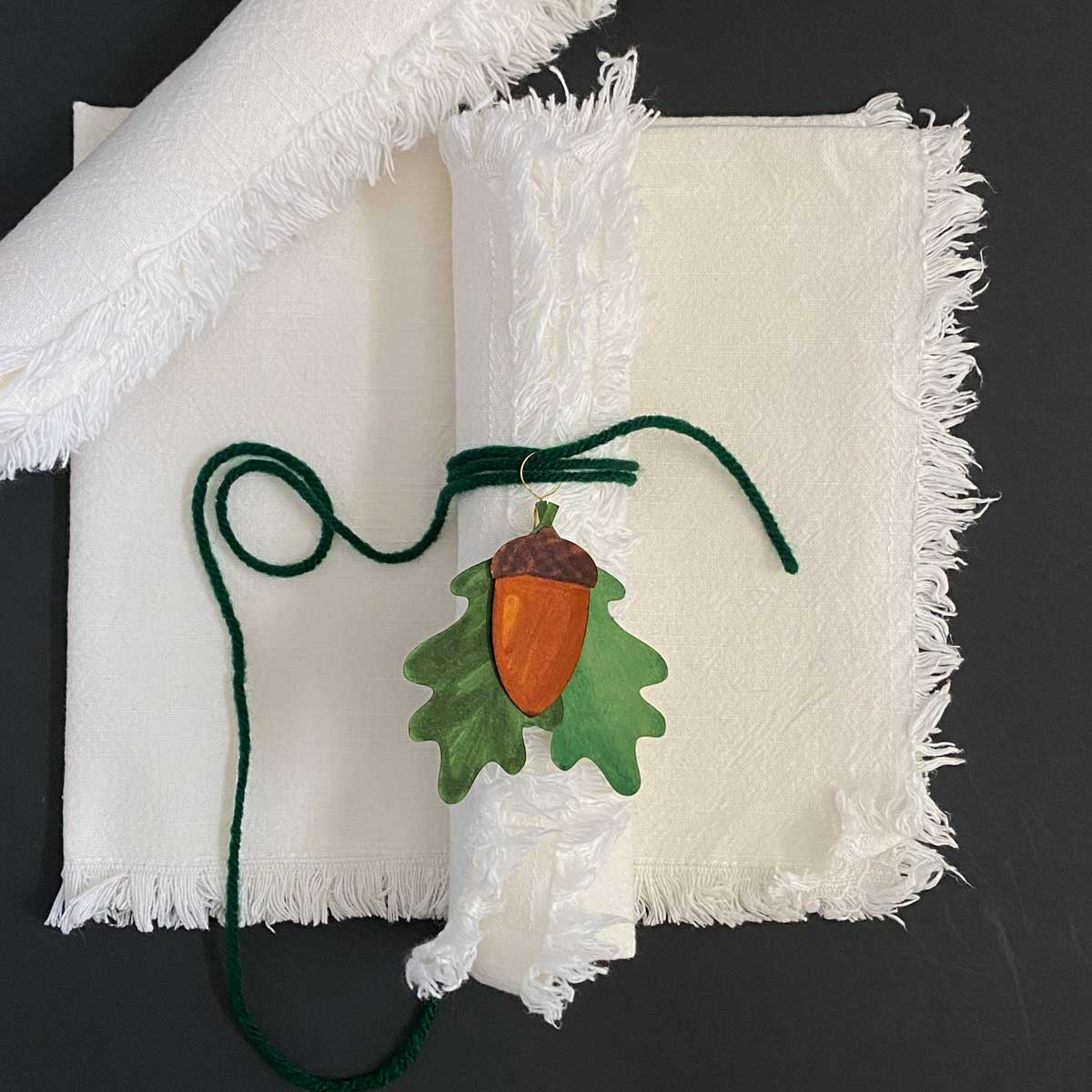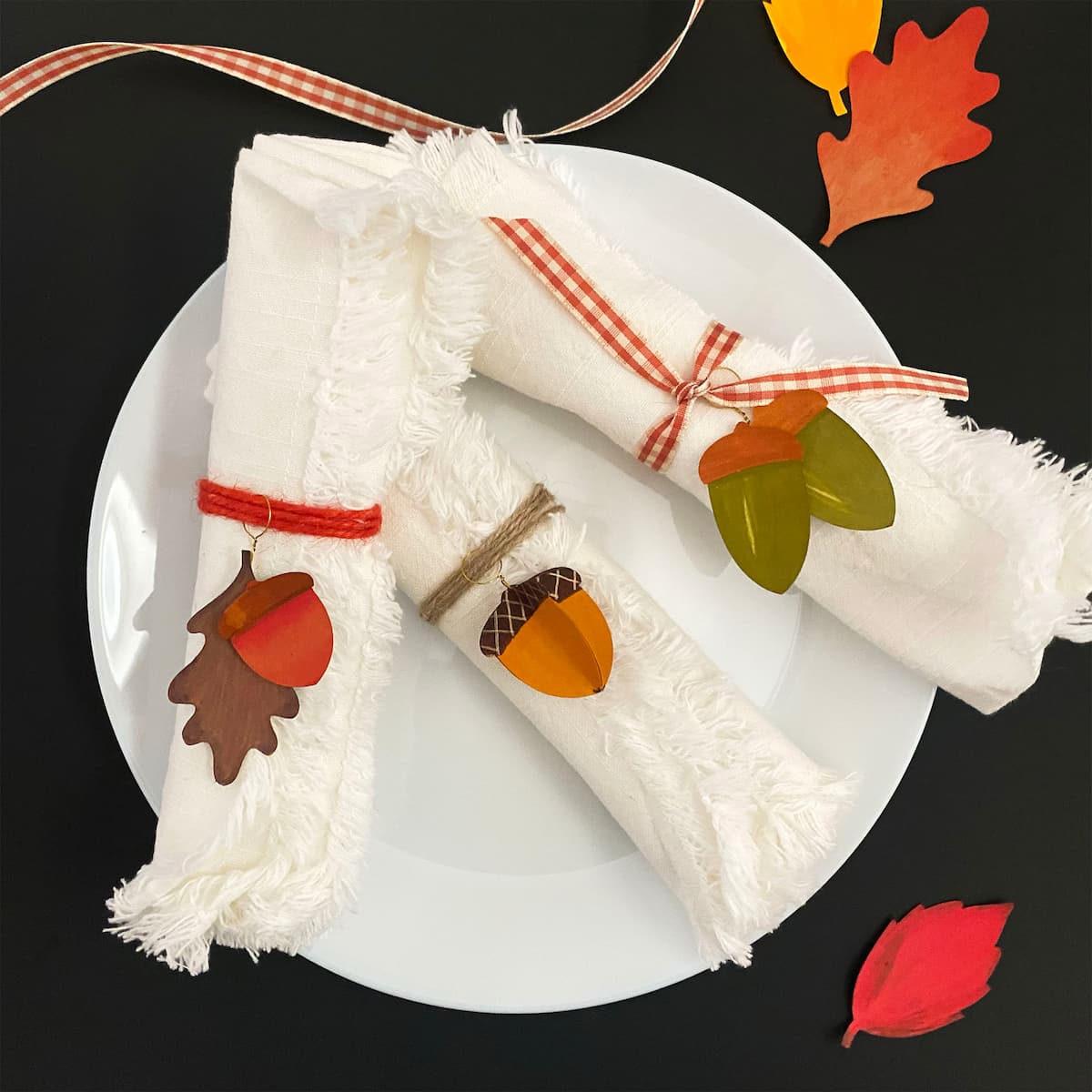 Elevate your table with a leaf-wrapped ring. Mix colors or add a tiny acorn for rustic flair. Grab your finished leaves or acorns, floral wire, yarn/ribbon, and scissors.