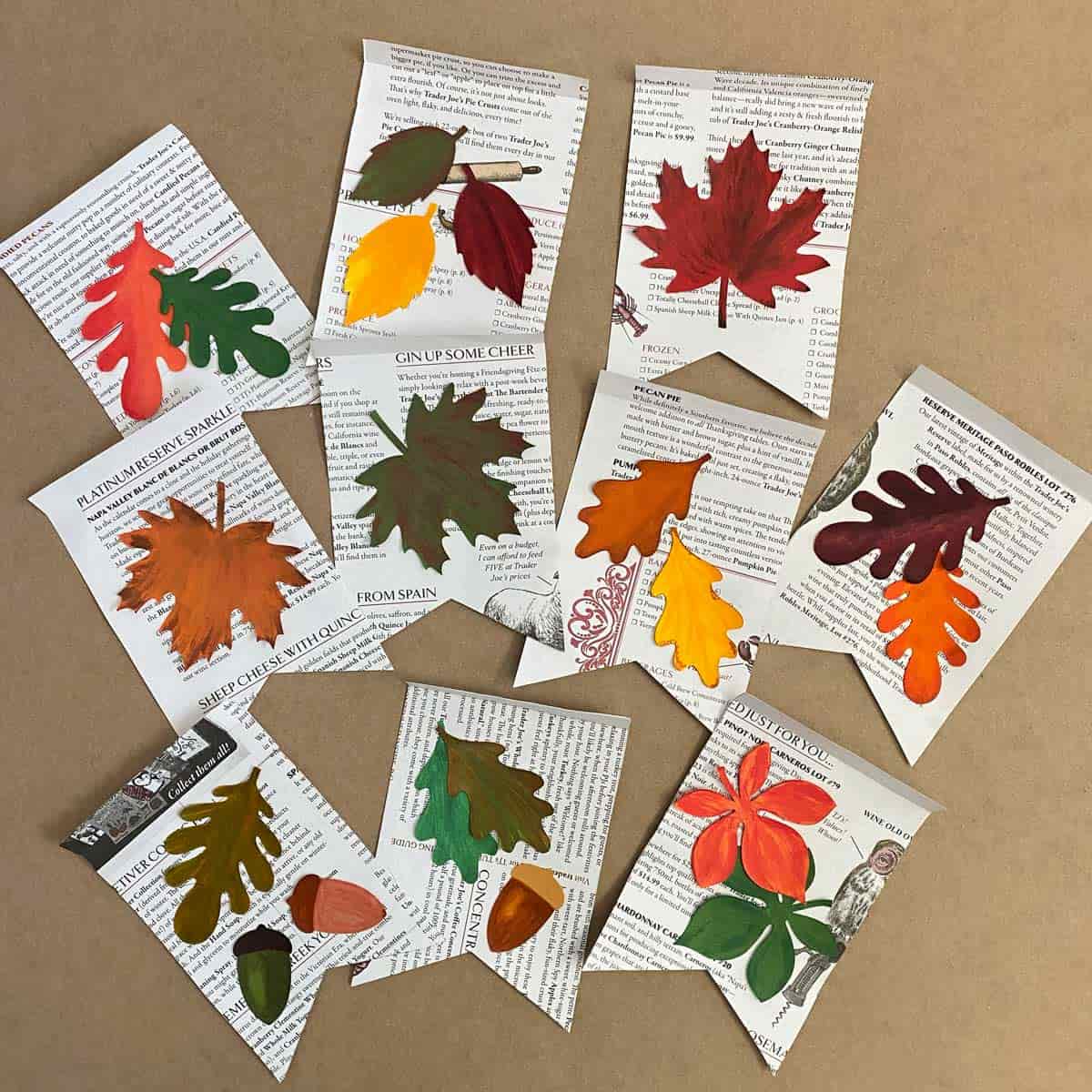 A charming, effortless nature banner that comes together using some painted leaves and printed pages cut into pennant shapes. You'll need: